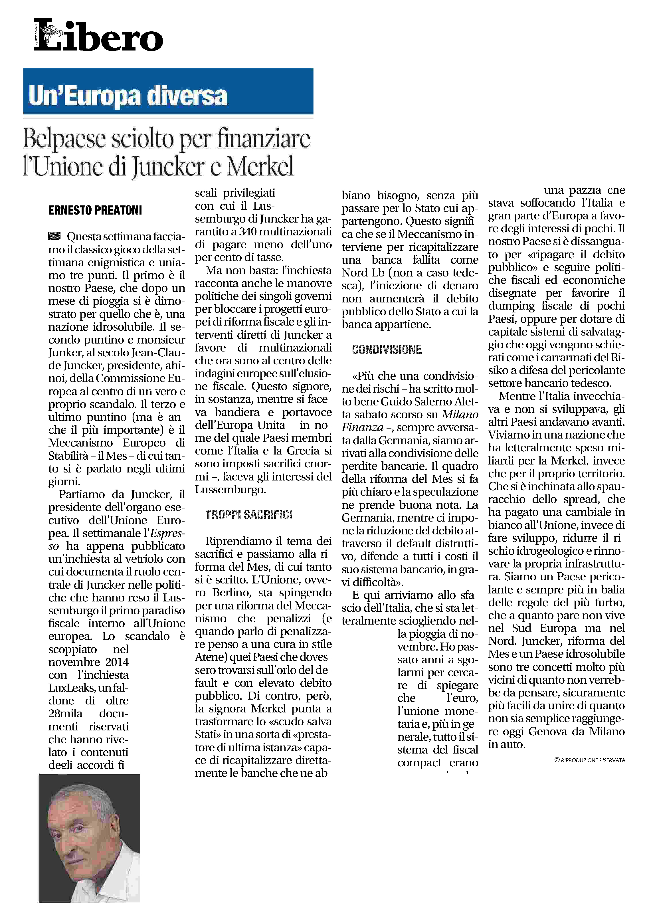 Libero – Belpaese sciolto per finanziare l’Unione di Juncker e Merkel Clicca qui per leggere l’articolo