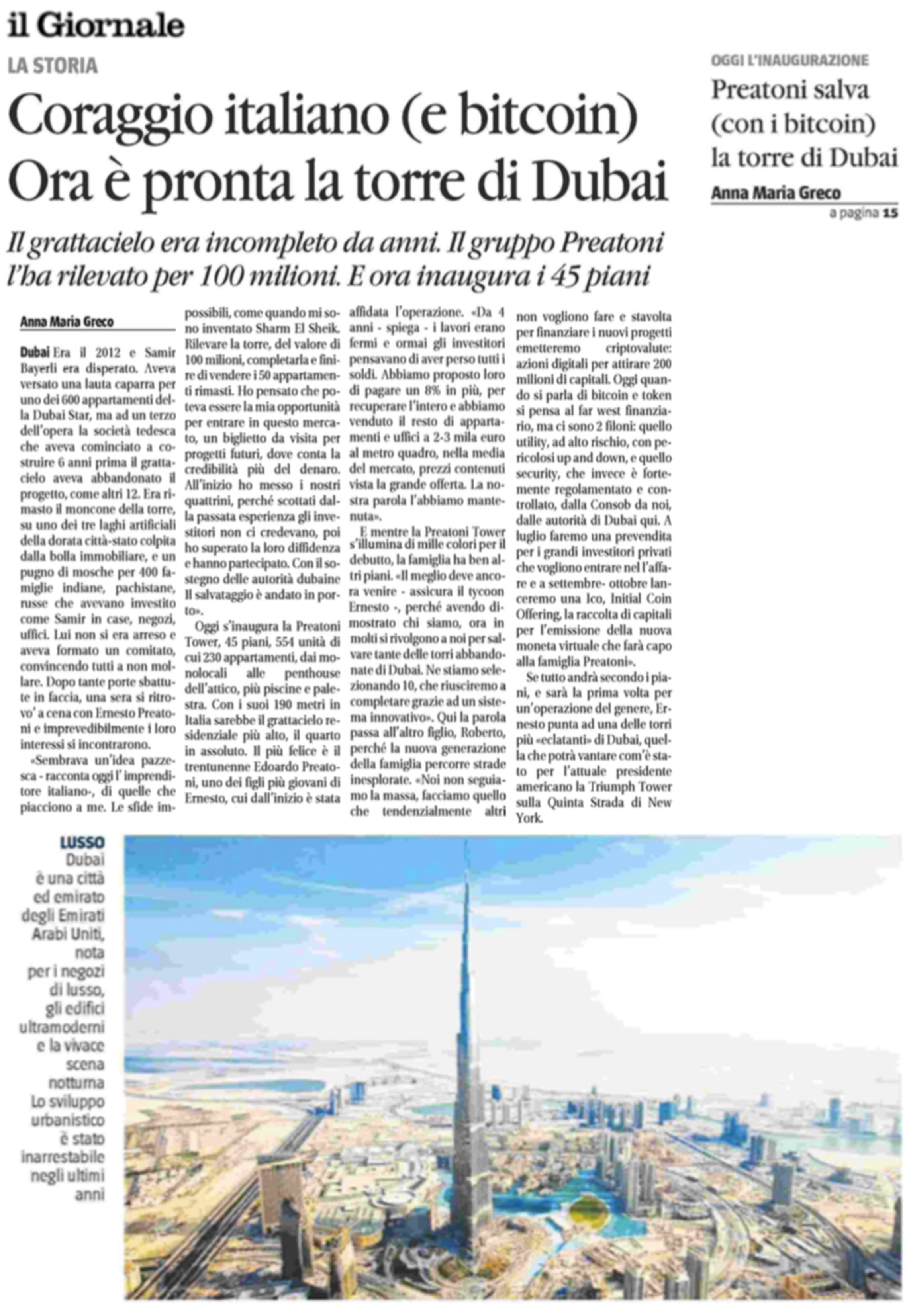 Il Giornale – Coraggio italiano (e bitcoin). Ora è pronta la torre di Dubai Clicca qui per leggere l’articolo