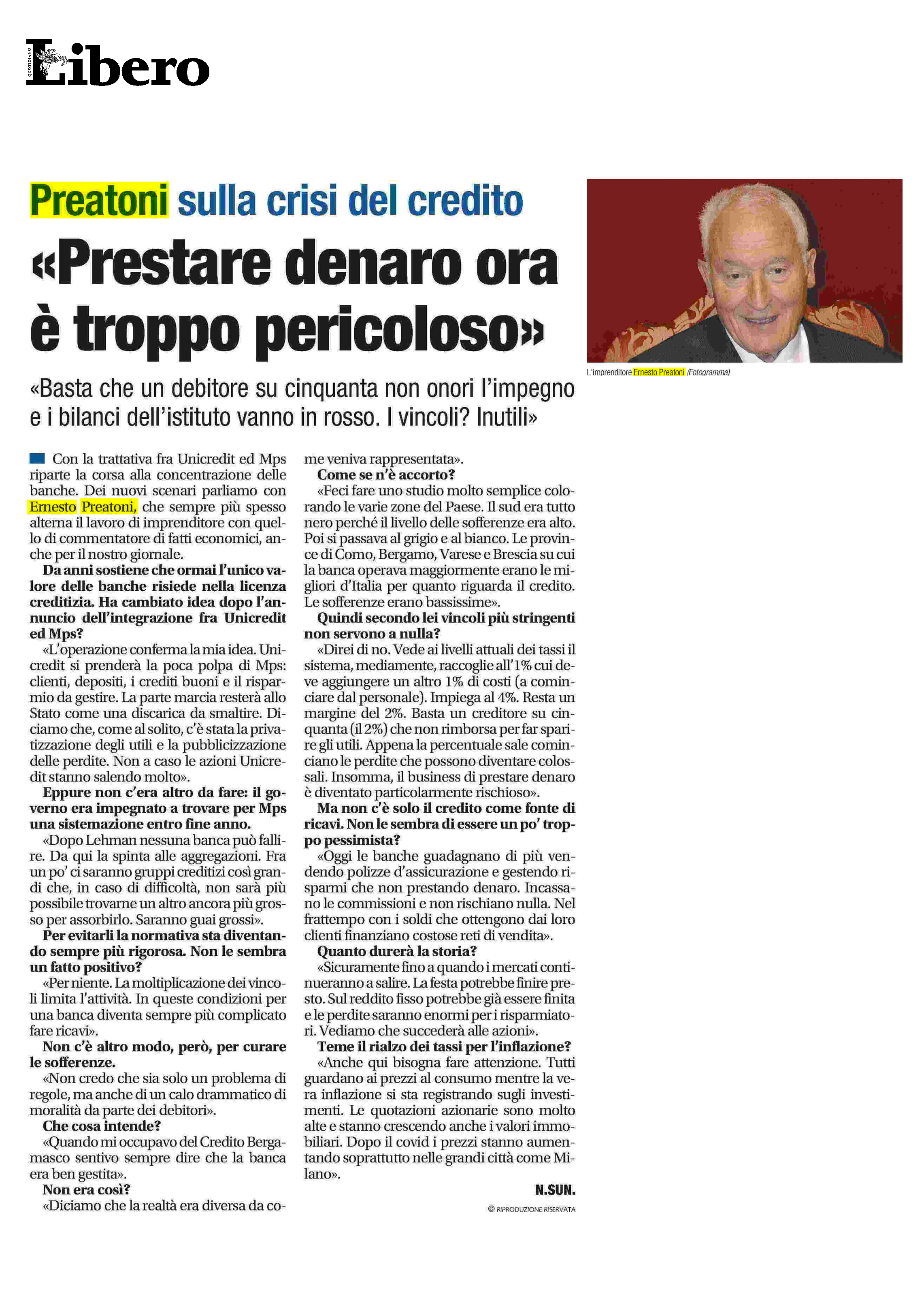 Libero – Preatoni sulla crisi del credito: “Prestare denaro ora è troppo pericoloso”