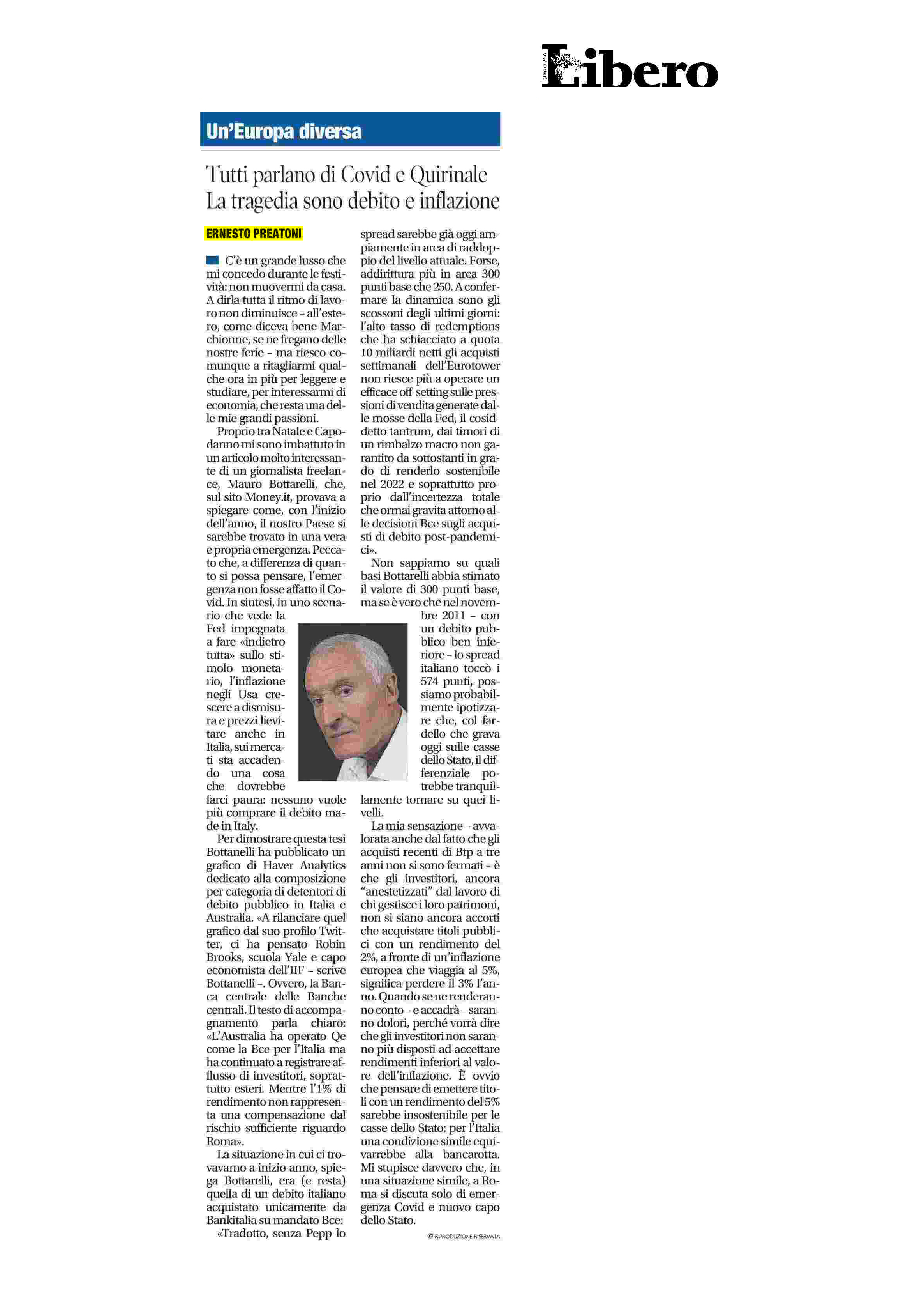 Libero – Tutti parlano di Covid e Quirinale. La tragedia sono debito e inflazione.